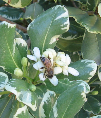 It's that time of year when so many fragrant plants beging to bless us. We call Philadelphus 'Mock Orange.' I can't remember that I've ever seen Pittosporum in bloom here where it is grown for the foliage.